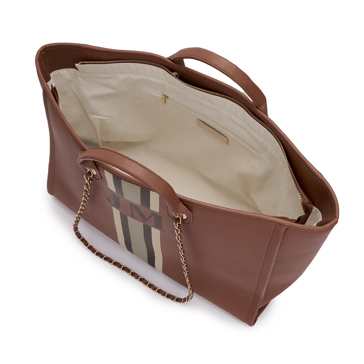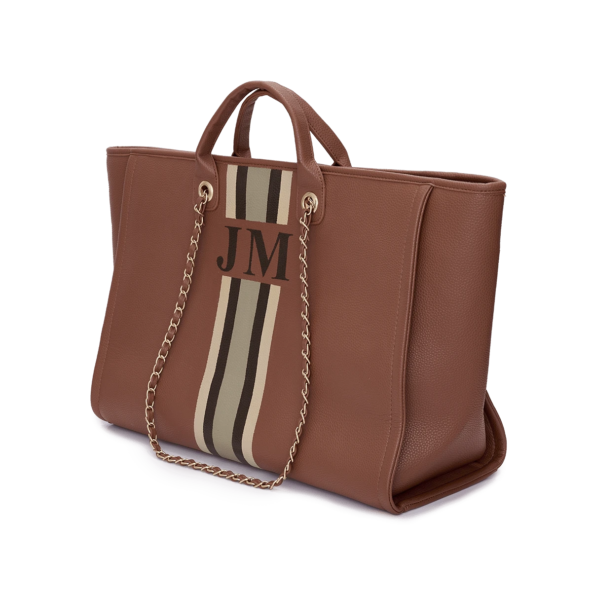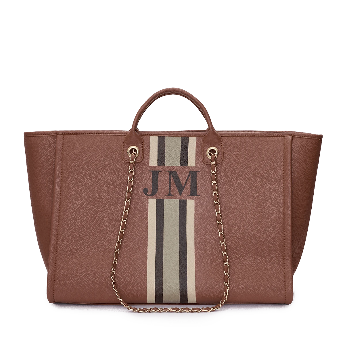 Step out in style with our classic chain tote bag in tan, featuring personalised design and golden chain detailing.Â