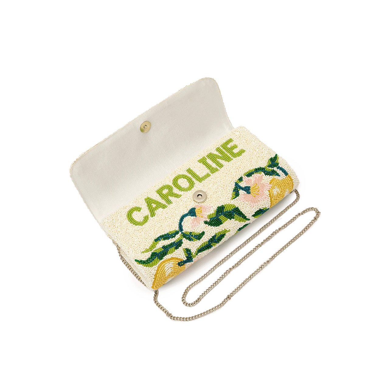 The Citron Beaded Clutch features a secure chain strap and compact structure. The front design includes hand-beaded details and a soft texture. Its lemon shade fits warm weather and casual settings.