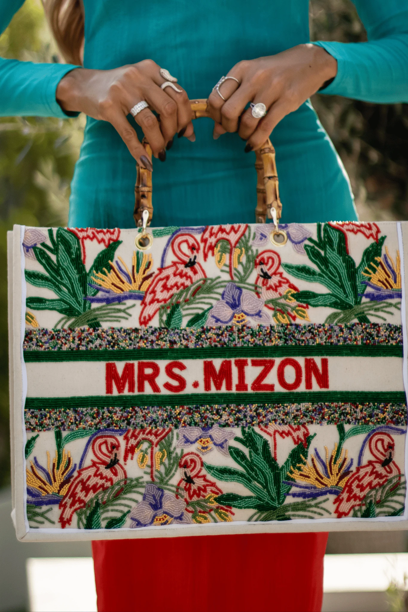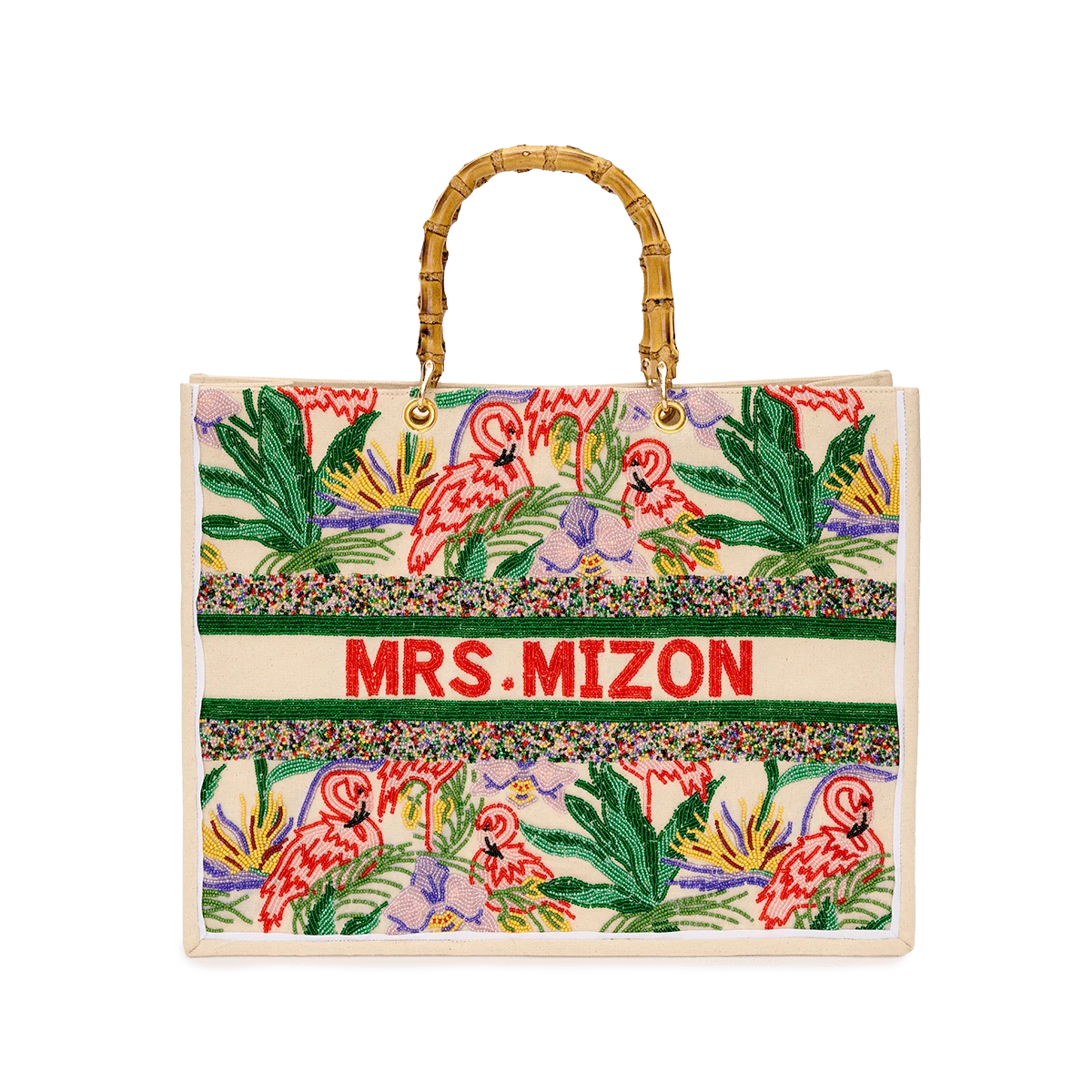 Expertly crafted by hand, this beaded Tote boasts a unique flamingo design and durable bamboo handles for a touch of natural elegance.