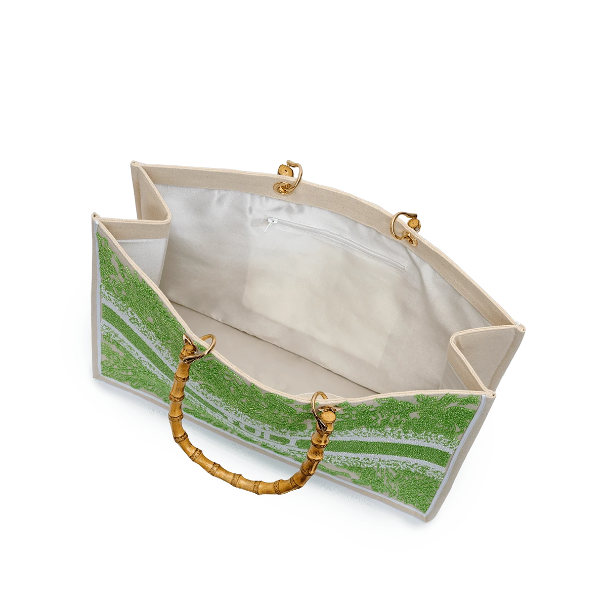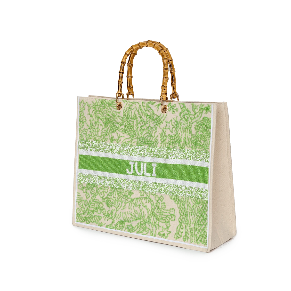 Expertly crafted by hand, this beaded Tote boasts a unique design and durable bamboo handles for a touch of natural elegance. Perfect for carrying all your essentials, this tote will elevate any outfit while showcasing your environmentally-conscious sensibilities.