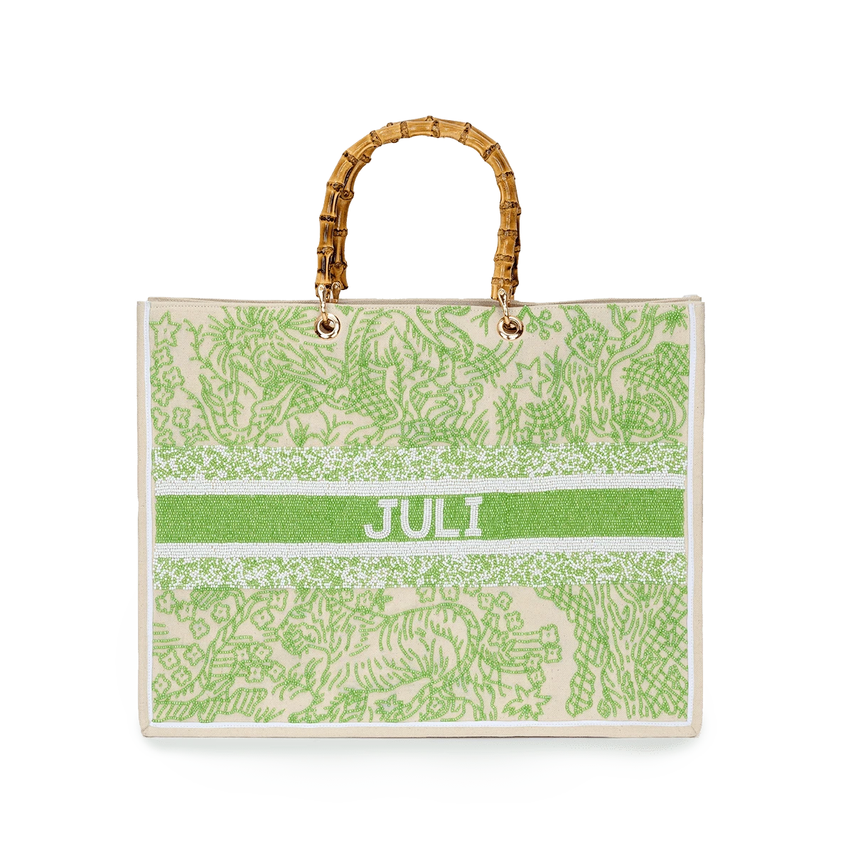 With unique handle and fine bead detailing, turn heads with your very own customisable tote.
