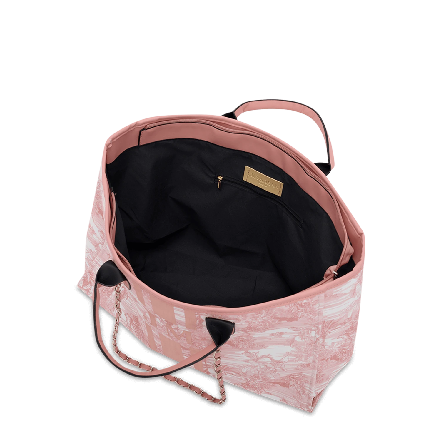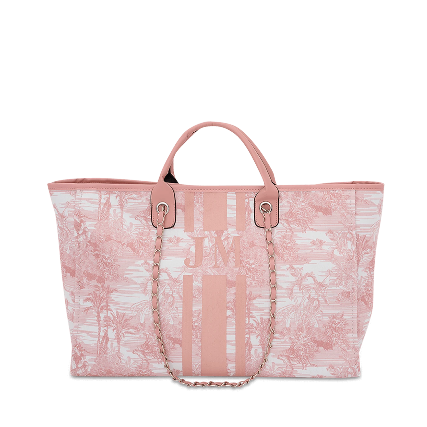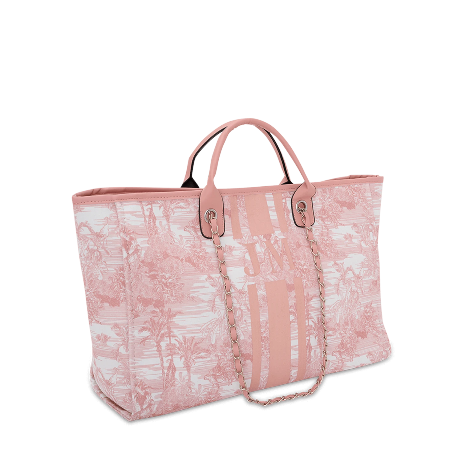Meet your new go-to weekend bag. Perfect for everyday carrying, weekends away with the girls or for new mamas, our Lily tote bag comes in a beautiful tropical pink pattern and can easily be styled with any outfit. With plenty of space to fit your essentials, this tote comes with a beautiful chain strap as well as secure inside pocket to keep all your valuables secure.Â