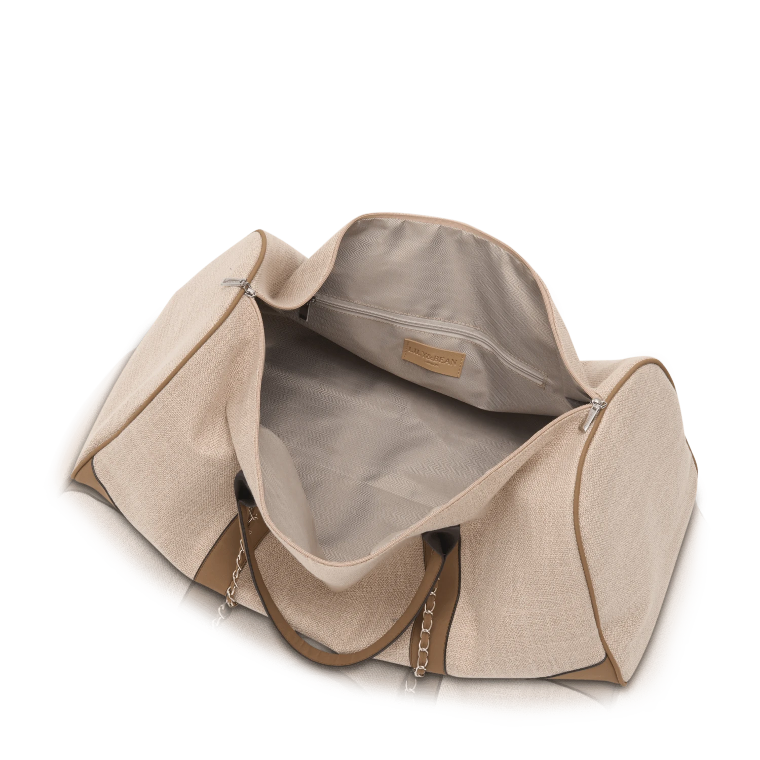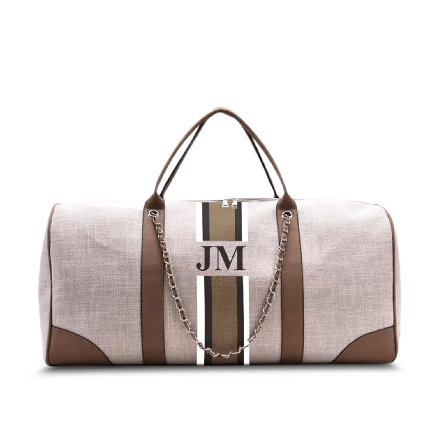 Stylish yet roomy, our Take Me Away Duffel in Soft Fawn can fit all your weekend needs. Crafted from our durable L&B canvas with fine leather and gold chain detailing with our trademark personalisation, the Take Me Away travel bag is ready for your next adventure!!